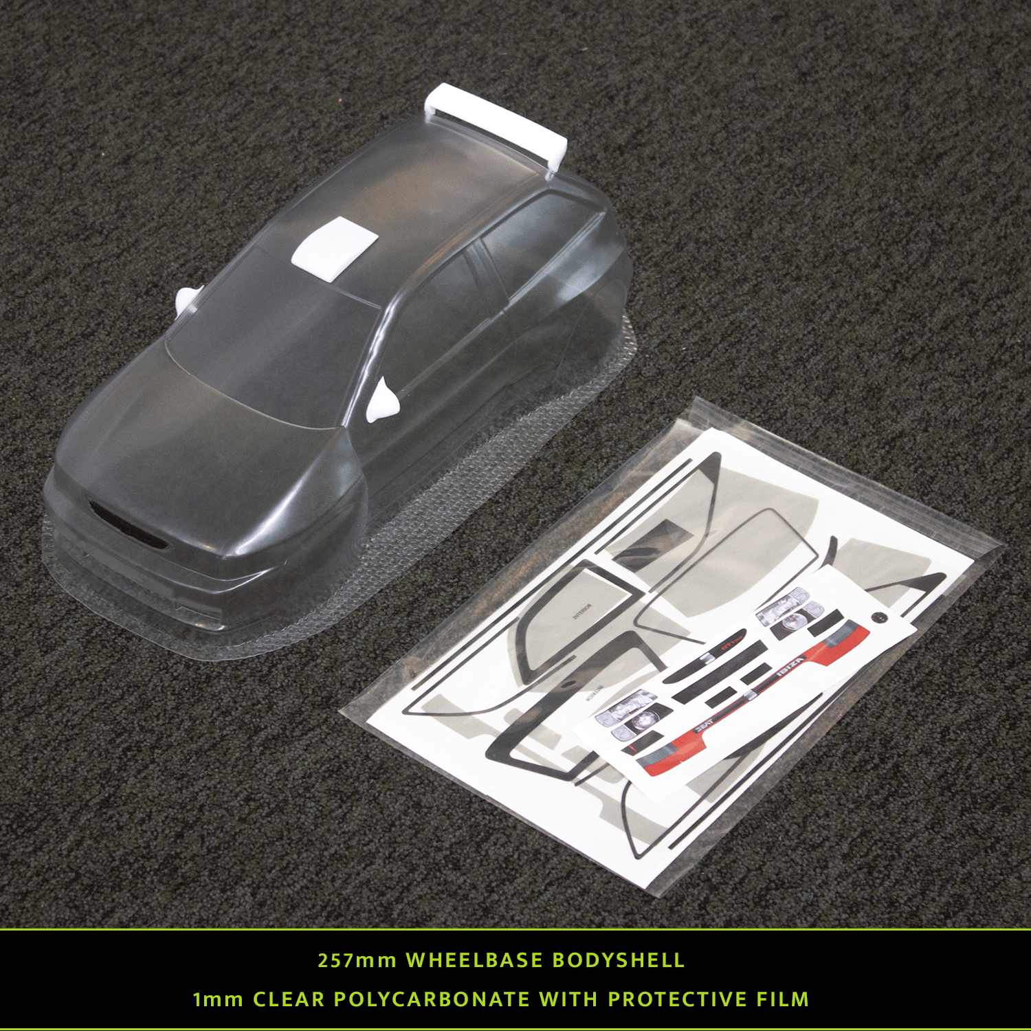 The bodyshell is made of 1mm clear polycarbonate and comes with a protective film.
