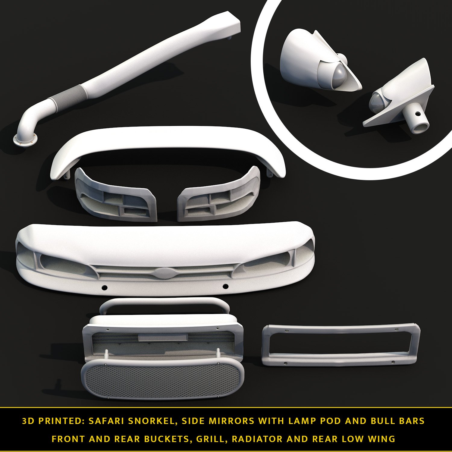 - 3D printed special Safari accessories: side mirrors with lamp pod, snorkel and bull bars.